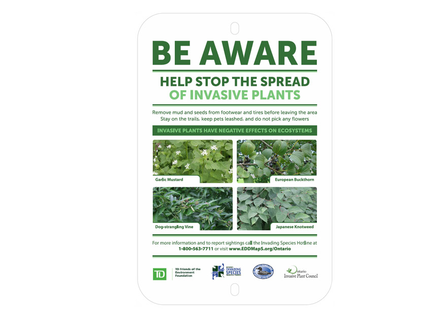 Metal trail-head sign created for the Ontario Invasive Plant Council (OIPC) and EDDMapS.