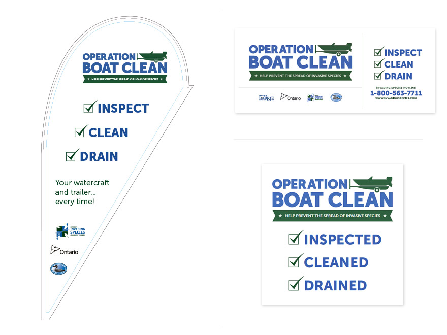 Banner, poster, flag, sticker and location sign art for Operation Boat Clean campaign. The monochromatic colours and the easy to read graphics helped the goal of the program which was to grab the attention of boaters and to encourage them to clean their equipment to avoid spreading invasive species.