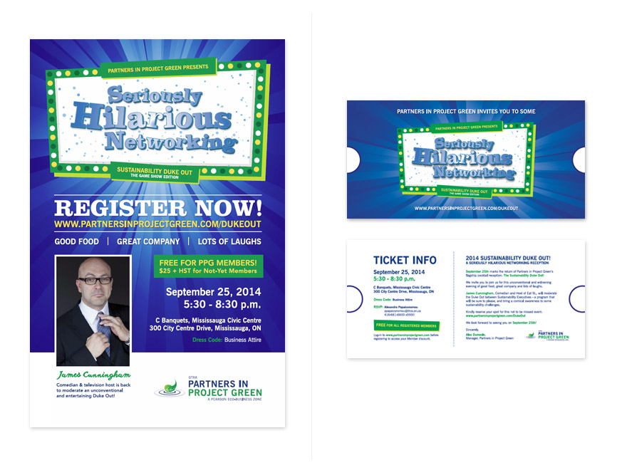 Poster, invitation and website graphics for Partners in Project Green’s annual networking event. Stand-up comedy themed event art played on the headlining host’s star power and showcased the event as a fun way for members to network.